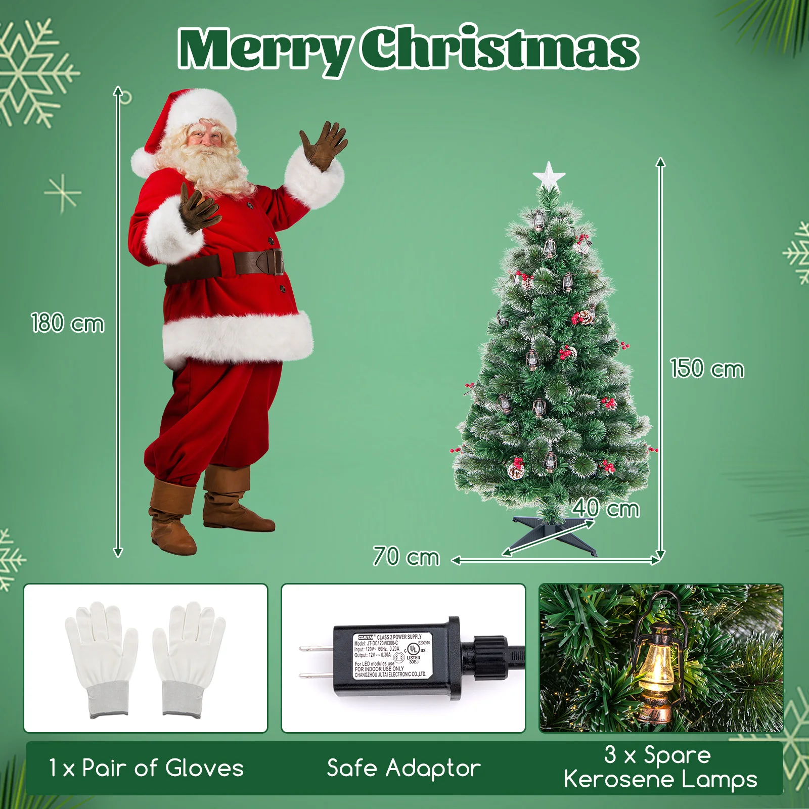 Elevate your festive decoration with a realistic 150 cm Xmas tree adorned with 170 lush branch tips, snowy pine needles, 16 natural pine cones, and 16 clusters of red berries. Illuminate your space with 49 warm white LED lights, which are distributed among the treetop star and 20 antique kerosene lamps, offering a charming lighting display. With 8 lighting modes, such as chasing/flash, slow fade, sequential, twinkle/flash, slo-glo, and more, the Xmas tree becomes more attractive. Thanks to new PVC, the decoration tree is safe, smell-free, non-allergic, and fireproof. The Xmas tree comes with gloves and spare kerosene lamps for your convenience. Experience the warmth of winter with this elegant and practical Christmas tree. Merry Christmas! If you are looking for such a product, do not hesitate to buy it!