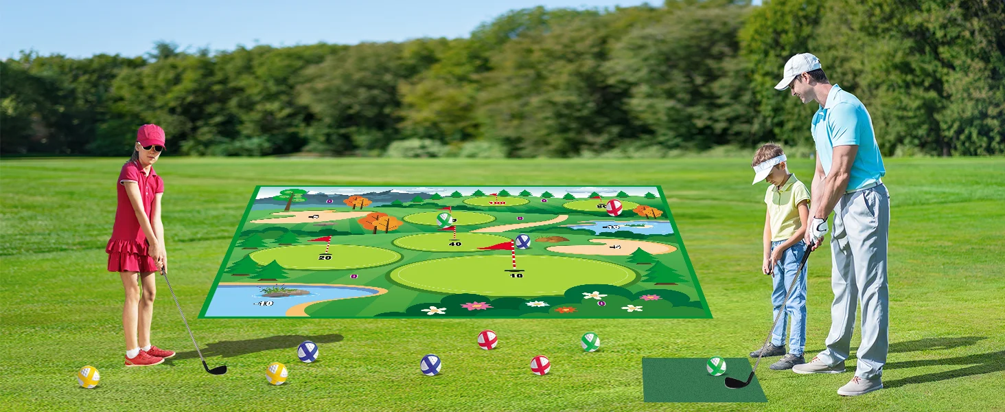 • Family & Party Game Fun: Fight for a win! Each player takes a turn chipping their ball to the mat trying to hit the marked scoring area to get the most points. The mat is brightly colored with a center goal and obstacles. Shoot for the center for the most points. Just beware of the sand traps and water. Those are negative points