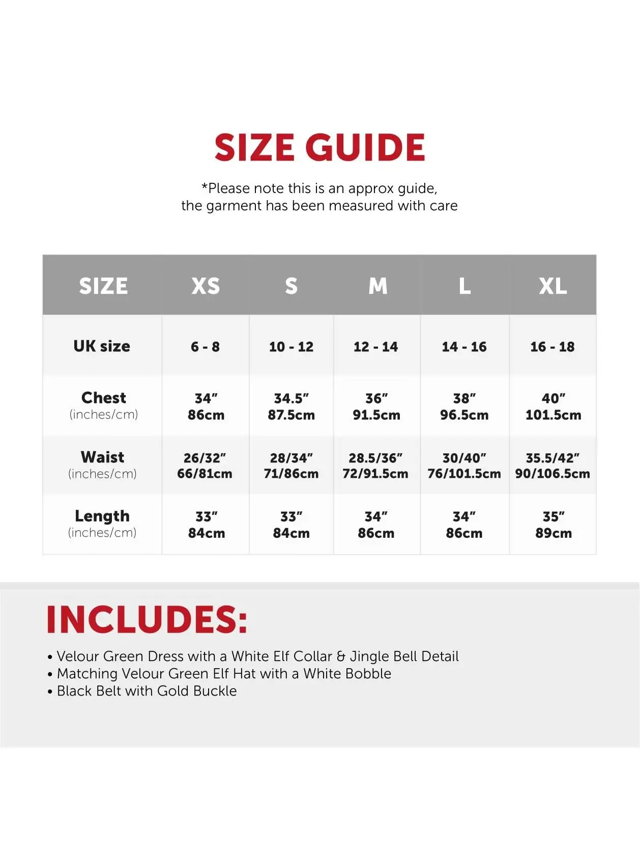 AVAILABLE IN MULTIPLE SIZES: Your Ladies Sexy Velour Elf Dress is available in multiple sizes from X-Small to X-Large: X-Small (UK 6 – 8) Chest 34" (86cm), Waist 26/32" (66/81cm), Length 33" (84cm) | Small (UK 10 – 12) Chest 34.5" (87.5cm), Waist 28/34" (71/86cm), Length 33" (84cm) | Medium (UK 12 – 14) Chest 36" (91.5cm), Waist 28.5/36" (72/91.5cm), Length 34" (86cm) | Large (UK 14 – 16) Chest 38" (96.5cm), Waist 30/40" (76/101.5cm), Length 34" (86cm) | X-Large (UK 16 – 18) Chest 40" (101.5cm), Waist 35.5/42" (90/106.5cm), Length 35" (89cm)