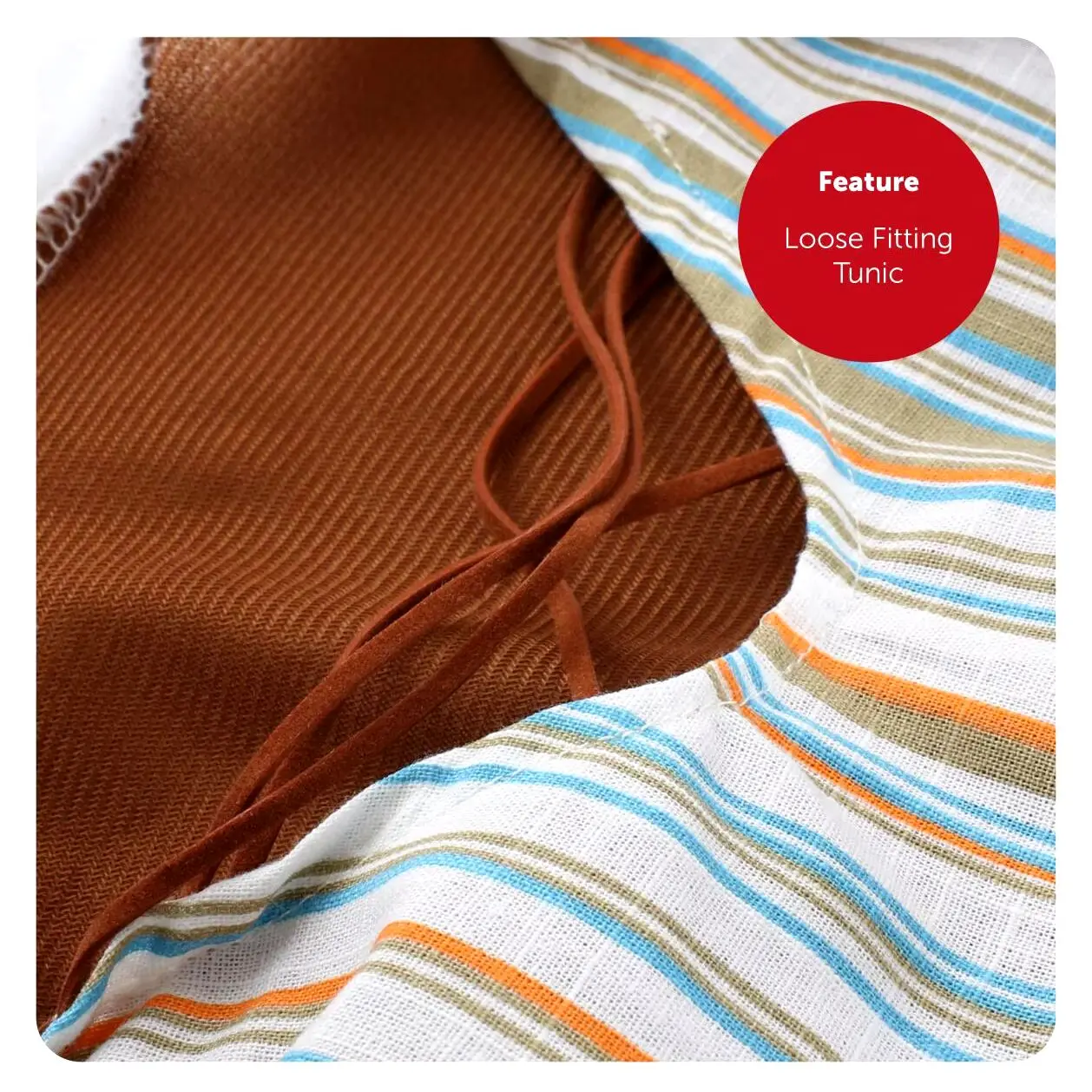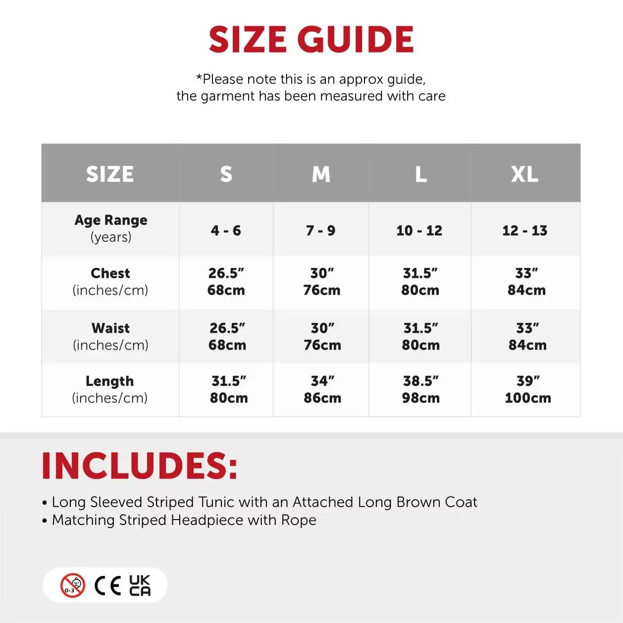 COSTUME INCLUDES: Our Child’s Shepherd Innkeeper Costume includes a Long-Sleeved Striped Tunic with an Attached Long Sleeve Brown Robe & Matching Striped Headpiece, which completes the look perfect for your child
