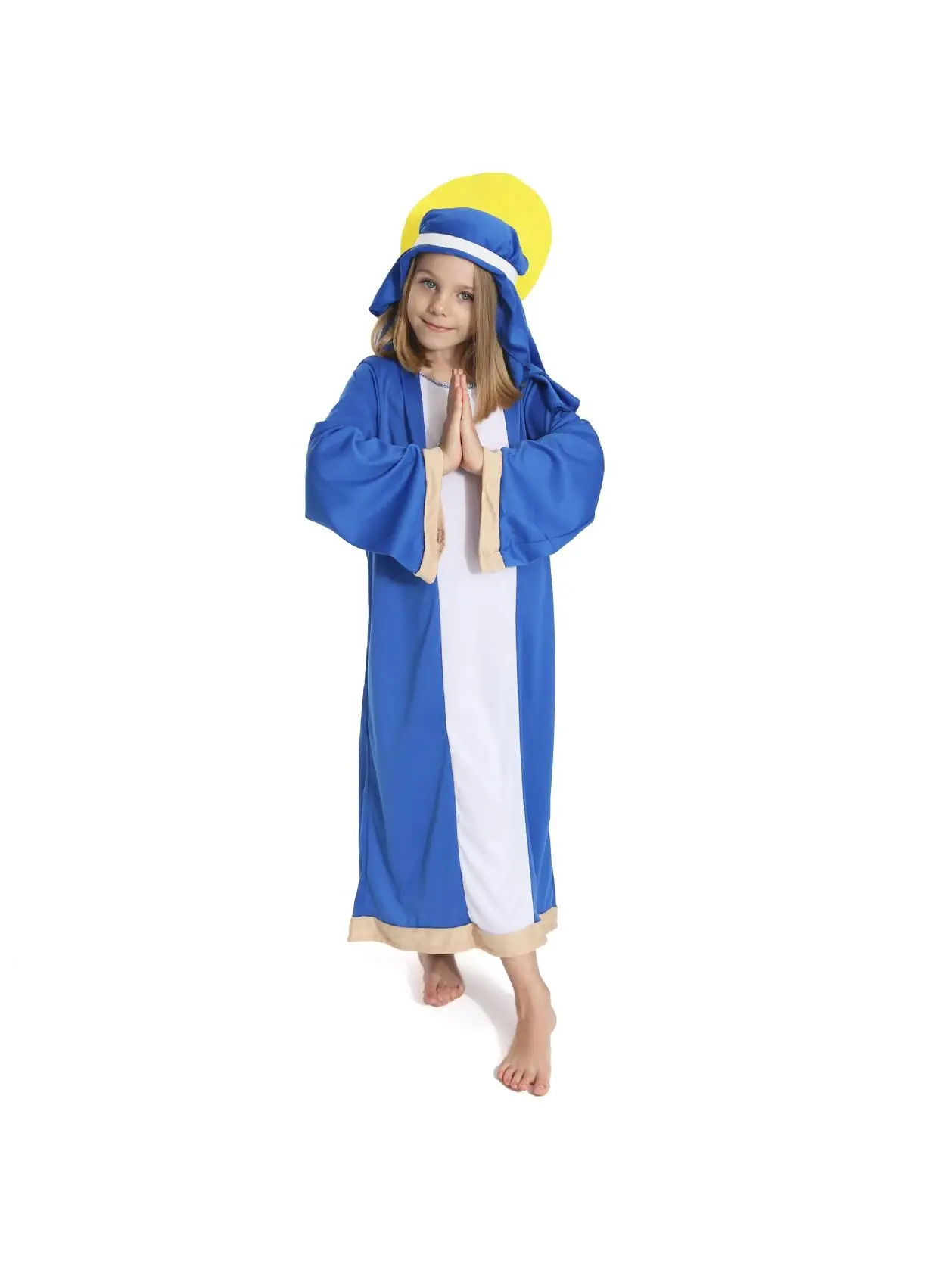 COSTUME INCLUDES: Our Child’s Mary Costume includes a Long Blue Tunic with a Matching Blue Headpiece with an attached Halo on the back of that headpiece, which completes the look perfectly for your child!