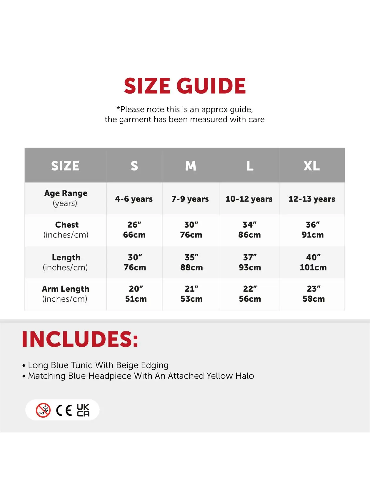PERFECT COSTUME SIZES: This Child’s Mary Costume is available in sizes Small – X-Large: Small: (4 – 6 years), Chest 26" (66cm), Arm Length 20" (51cm), Length 30" (76cm) | Medium: (7 – 9 years), Chest 30" (76cm), Arm Length 21" (53cm), Length 35" (88cm) | Large: (10 – 12 years), Chest 34" (86cm), Arm Length 22" (56cm), Length 37" (93cm) | X-Large: (12 – 13 years), Chest 36" (91cm), Arm Length 23" (58cm), Length 40" (101cm)