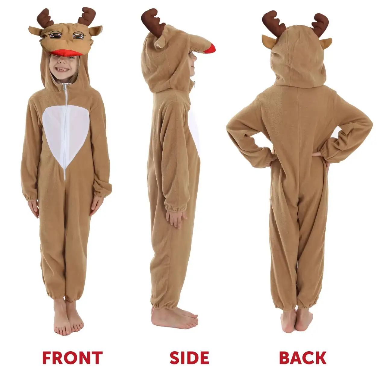 COSTUME DETAILS: Our Reindeer Costume includes a Zip-Up Rudolph the Red-Nosed Reindeer Jumpsuit, in a cosy Fleece Material for warmth, this comfortable Reindeer Costume with all its features is just what you’re looking for the start of Christmas!