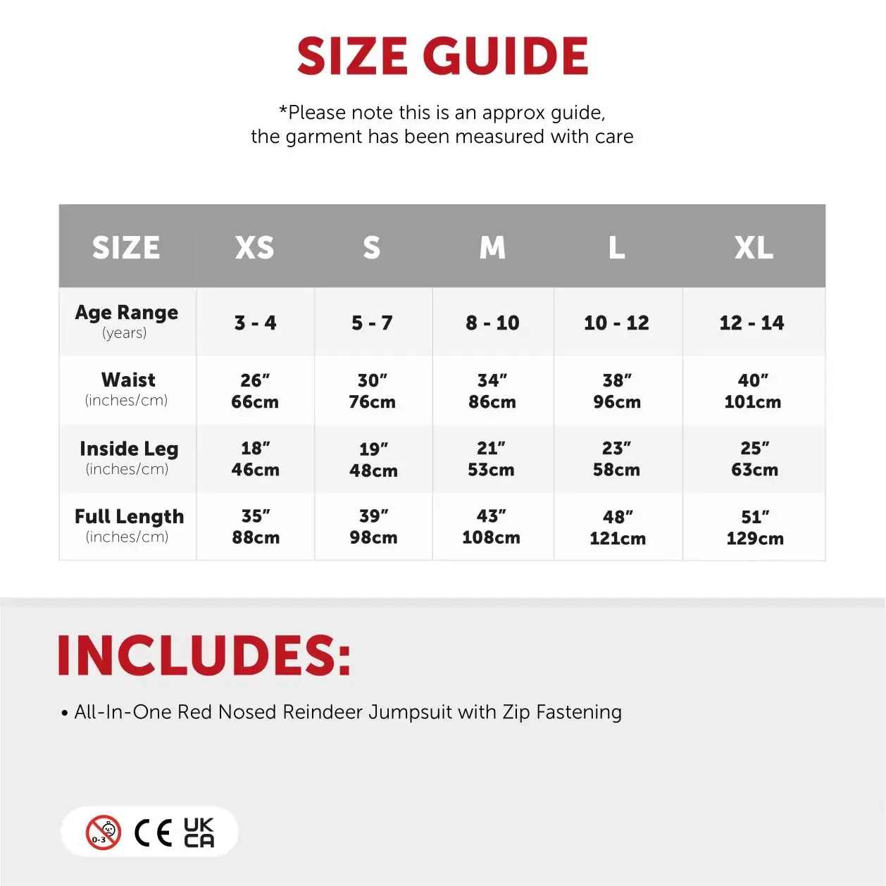 AVAILABLE IN MULTIPLE SIZES: The Child’s Reindeer Costume is available in multiple sizes from X-Small to X-Large: X-Small – (Age 3 – 4), Waist: 26" (66cm), Inside Leg: 18" (46cm), Full Length: 35" (88cm) | Small – (Age 5 – 7), Waist: 30" (76cm), Inside Leg: 19" (48cm), Full Length: 39" (98cm) | Medium – (Age 8 – 10), Waist: 34" (86cm), Inside Leg: 21" (53cm), Full Length: 43" (108cm) | Large – (Age 10 – 12), Waist: 38" (96cm), Inside Leg: 23" (58cm), Full Length: 48" (121cm) | X-Large – (Age 12 – 14), Waist: 40" (101cm), Inside Leg: 25" (63cm), Full Length: 51" (129cm)