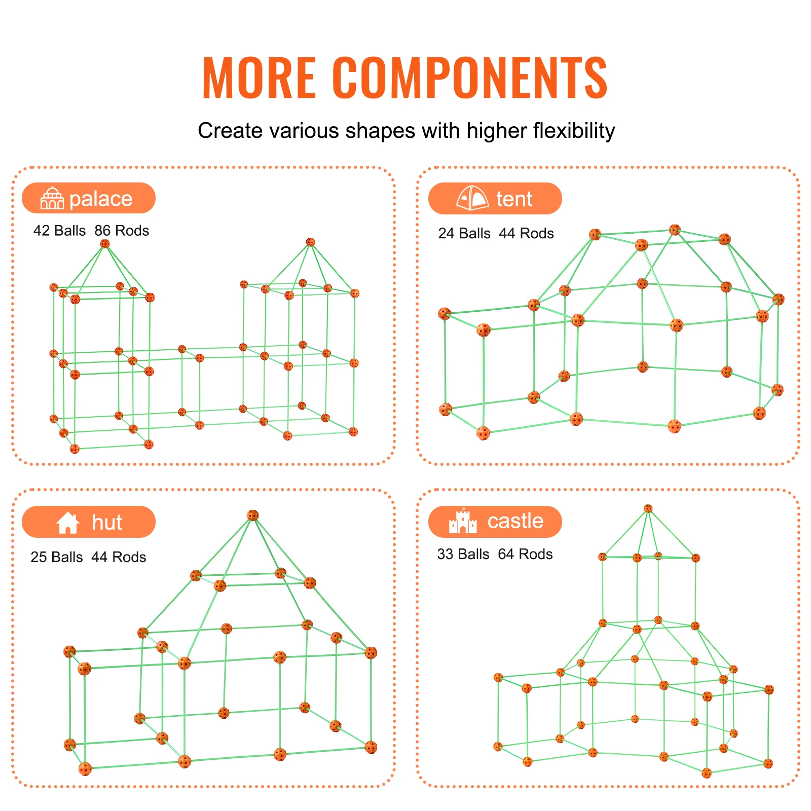 140-Piece Fort Building Kit: Explore endless possibilities with our kids fort building kit! It includes 44 solid balls and 96 lightweight yet durable connecting rods. Perfect for kids aged 4 and up to create their own 3D spaces—build forts, tents, pyramids, rockets, and more with parental guidance.